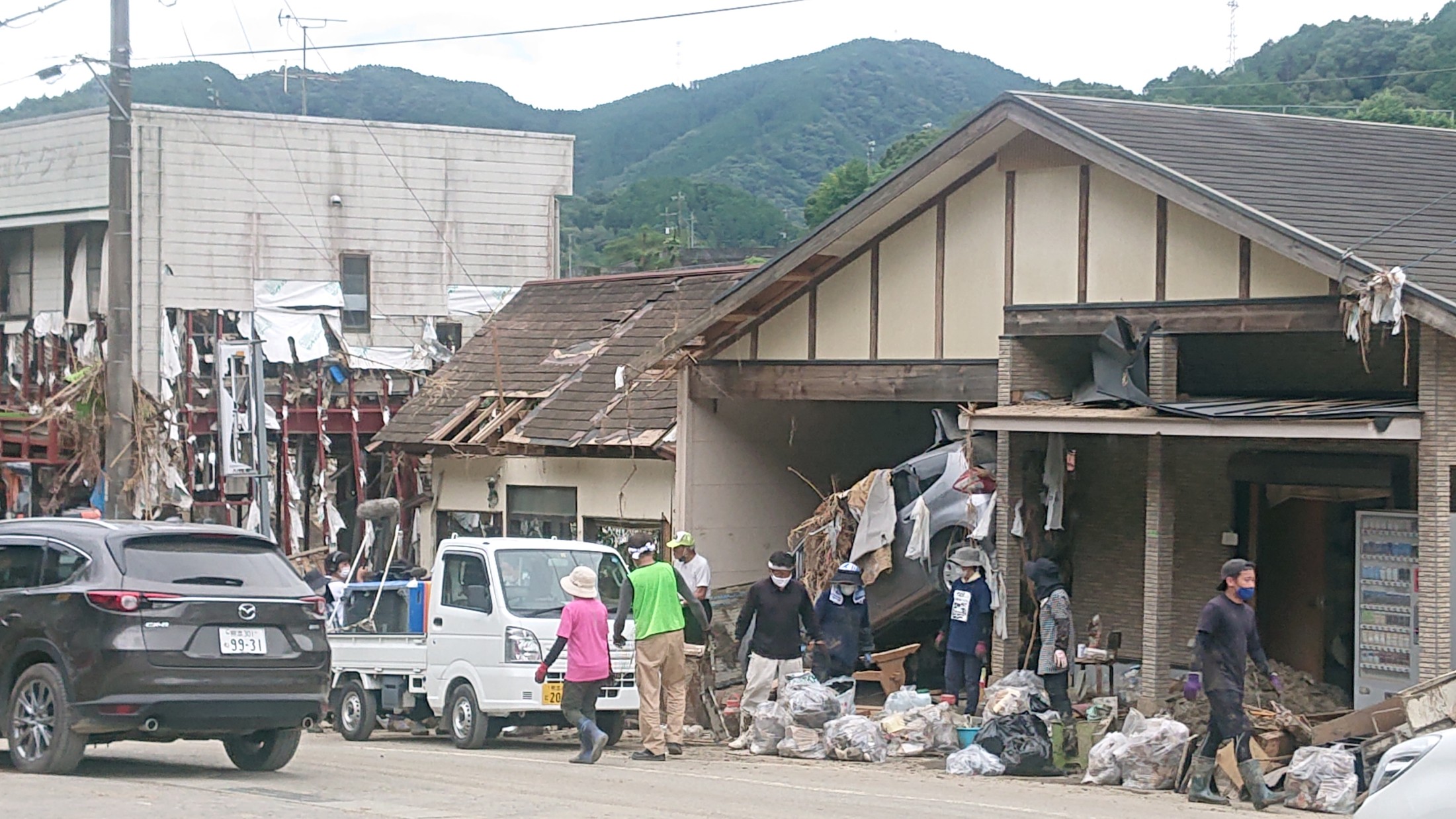 10:25 ズタズタになった球磨川の堤防沿いを真横にしつつ(流された赤い鉄橋)、災害支援車等との離合を繰り返し、目的地の現地被災者宅に到着しました……。