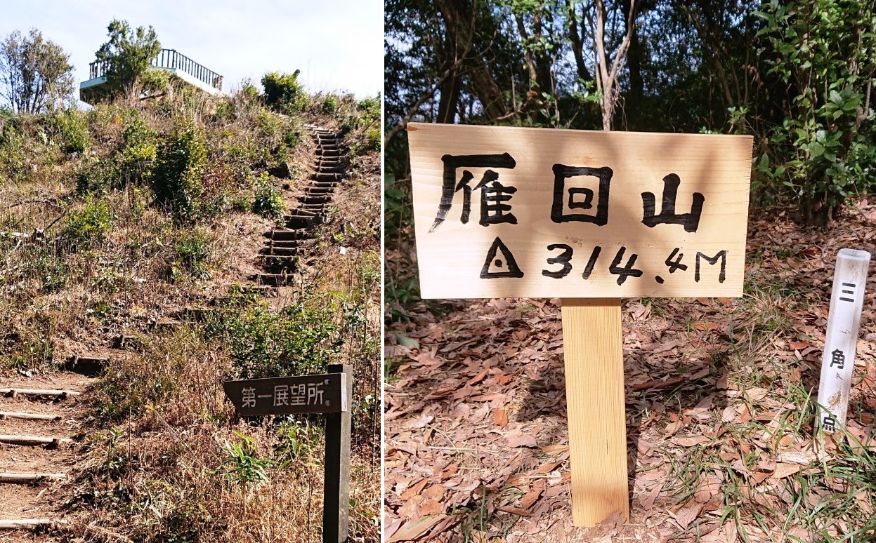 ・山の名前が珍しいのでネットで調べて見ました。(登る前に事前勉強?) ☆ 雁回山(314m)は、元々木原山と言われ、鎮西八郎源為朝の居城だったそうです。 為朝は強弓で、山を通る雁をいつも射落としていたそうで、そのため雁は恐れをなして木原山の上を避け、この山を回って通るようになったそうです。そう言うことから雁回山に…………。