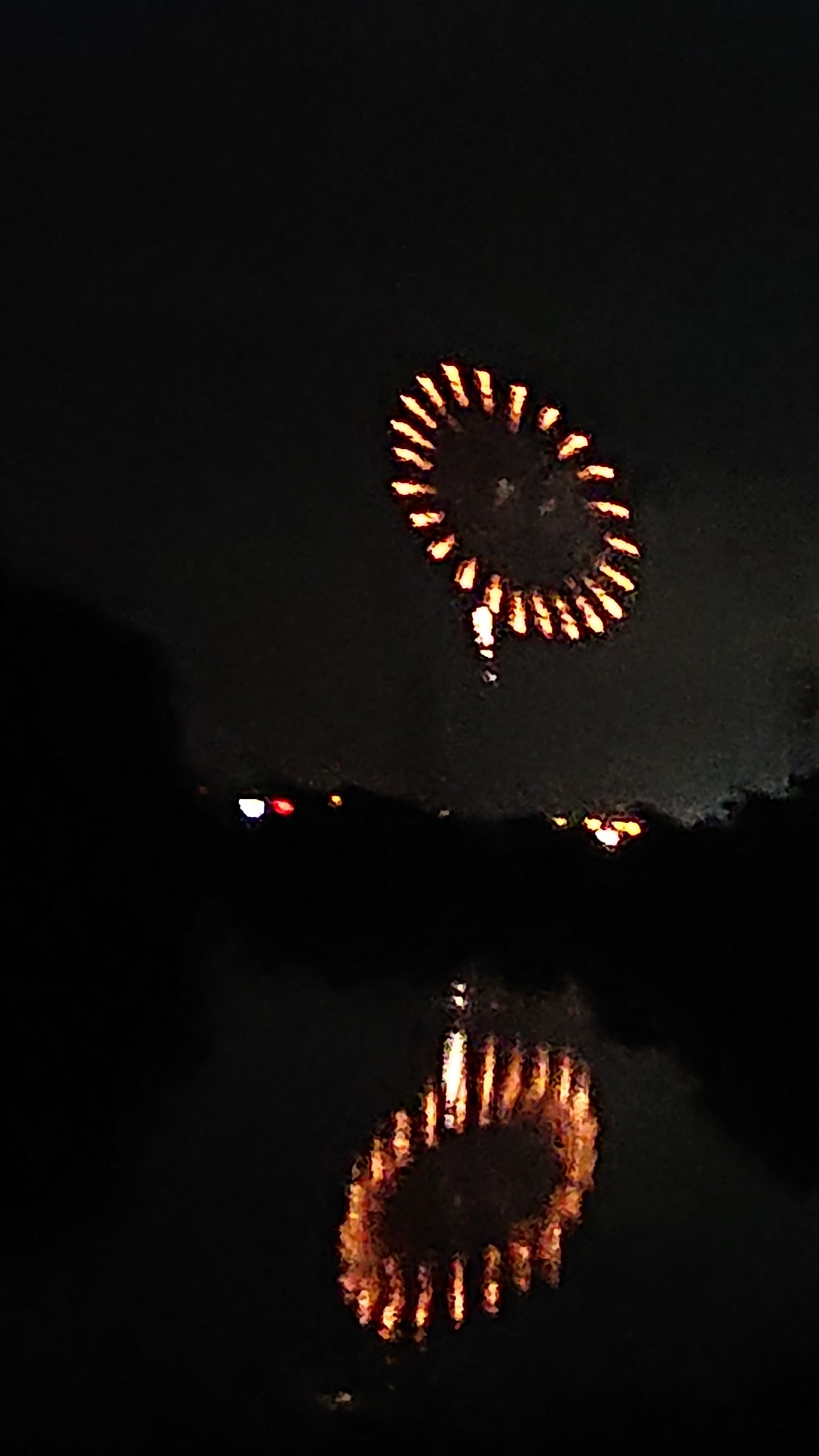 ウワー、凄い、素晴らしい、こんな光景は初めて……。 夜空だけではありません、なんと御船川の水面にも、花火の二重奏です、カメラポイントは御船インターチェンジ付近……。 暫く堪能して無事ゴールへ……。