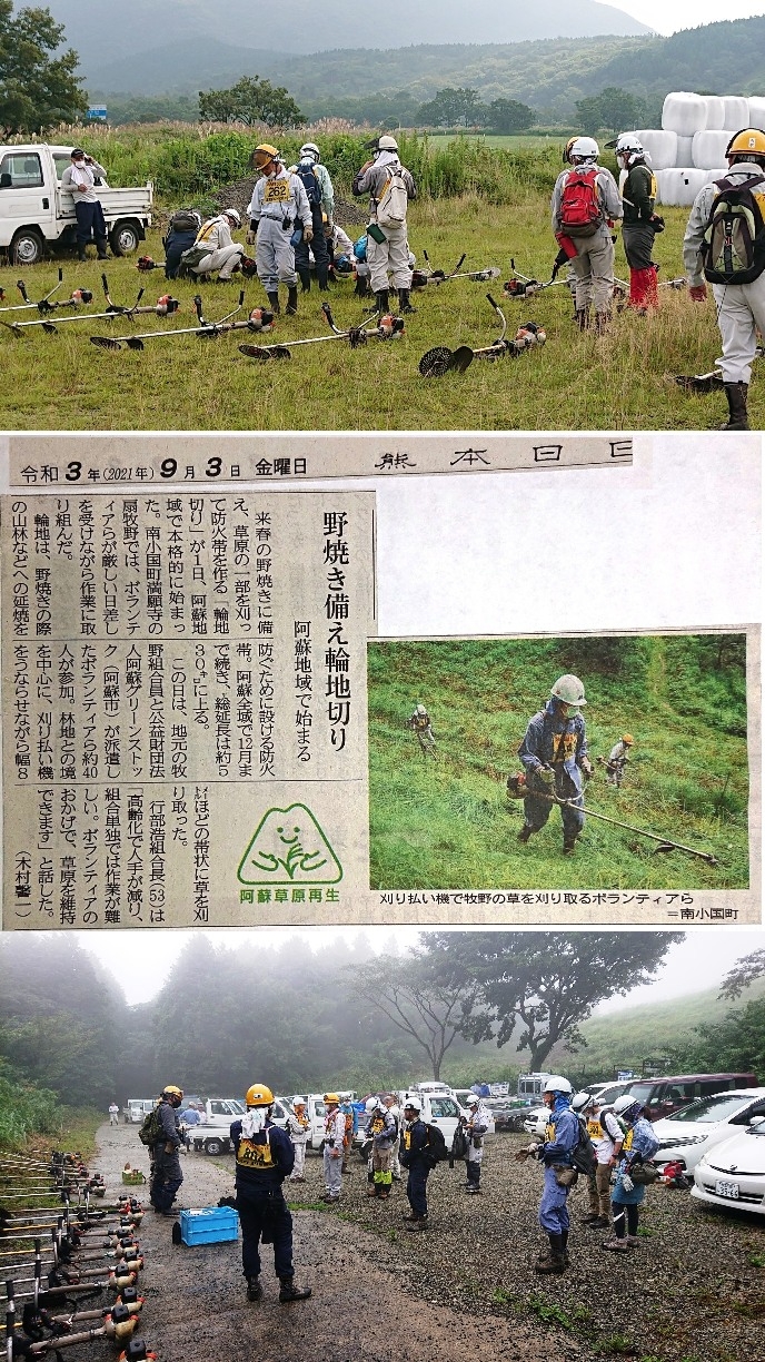 ・9/18(土) 08:30〜15:00 ・瀬田立野(南阿蘇村)牧野ゲート →国道57号線から阿蘇大津ゴルフクラブへ左折、ゴルフ場入口を通過して更に狭い道を山手に上る。前回は南小国・瀬の本高原で自宅から75k、2時間もかかったが、今回は近場で32k、1時間弱で到着でした。 お陰で早く、8時過ぎに着、それでも地元の牧野組合の方やボランティアリーダーの方は多く集まり、受付け、刈払い機の点検、混合油の補充、予備缶への注入と急ぎ回ってる。