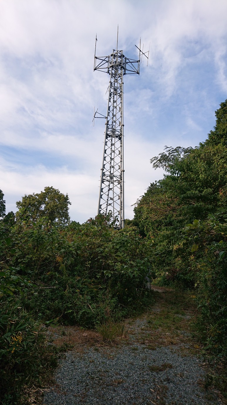 ☆ご主人に頂上を尋ねる、分からないがこの先にアンテナが有りそこが道路も終点とのこと。道案内も何も無いので取り敢えず前へ進む。 やはり無線基地か、鉄塔が見えて来た(写真)、道路も終点、脇道を探すも全く見当たらず。勝手にここを頂上と決めた。