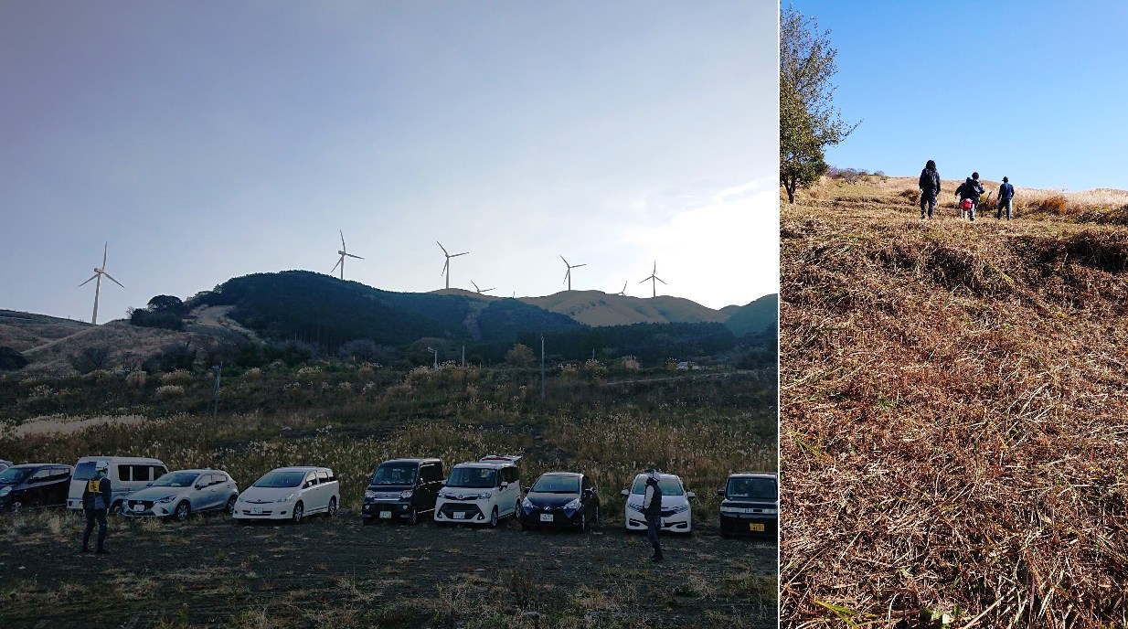 ・私達の班は6名(地元の方2名、ボランティア4名)、軽トラは俵山峠を目指して上へ、上へと上って行く。荷台なので風が寒く冷たい、風車(風力発電)を数基過ぎて停まる。
